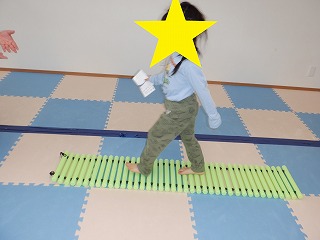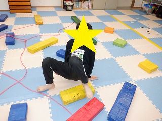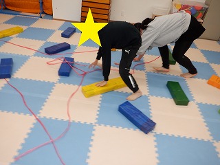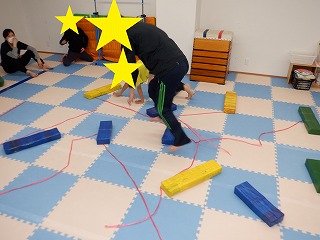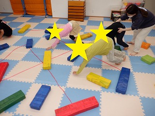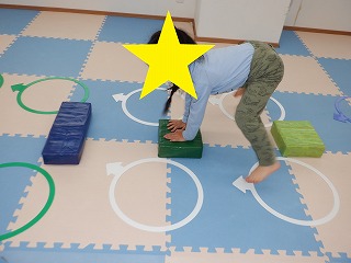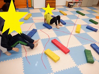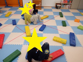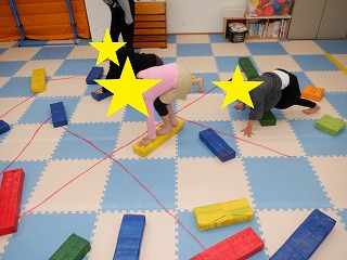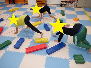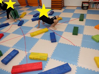 障害物クマさんでは、障害物の平均台、バランスストーンを踏まないようにクマさん歩きで進みます。