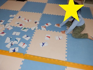 マッチングカードでは、2枚1組の恐竜のカードをバラバラにして置いてあります。好きな恐竜のカードを選んで、2枚1組になるようにカードを選びます。カードをマッチングできたら、トンネルを抜け、バランスブリッジを渡って、先生に恐竜カードを渡します。