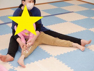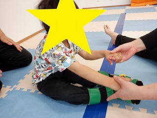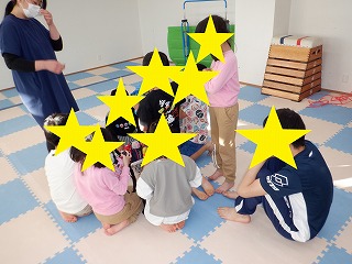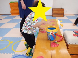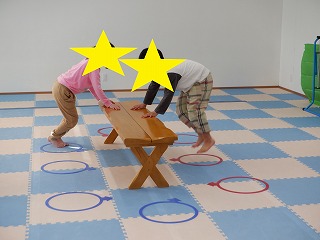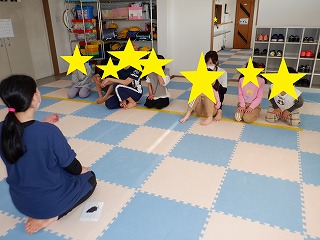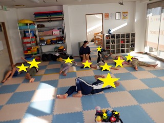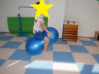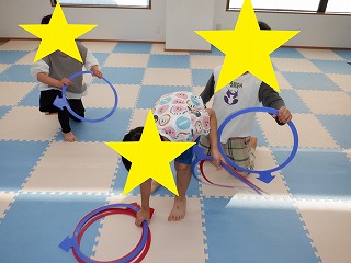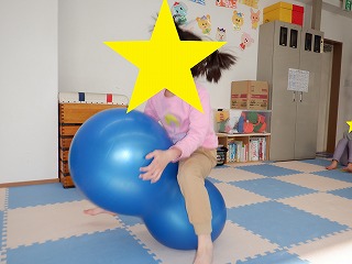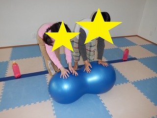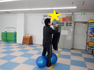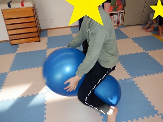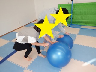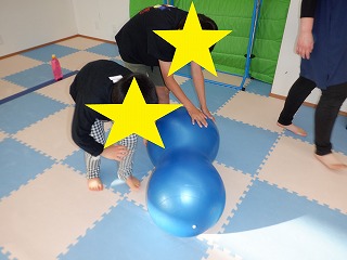 協調性を養う為にお友達と一緒にジャンプをしたり、バランスボールをお友達と息を合わせて転がしました。