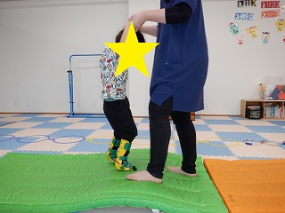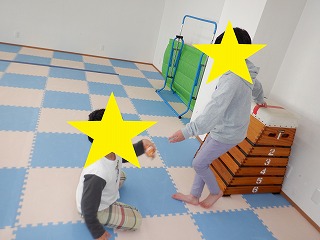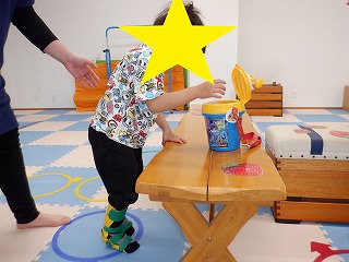 椅子や跳び箱につかまりながら歩きます。横歩きにも挑戦しました✨