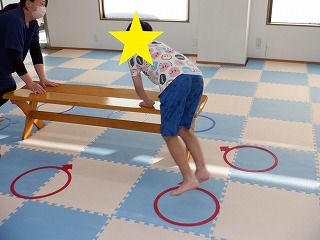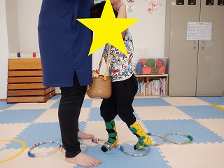 小さいフープや大きいフープの中を一歩ずつ慎重に歩いていきます。