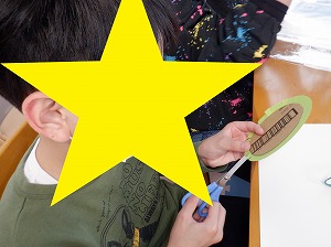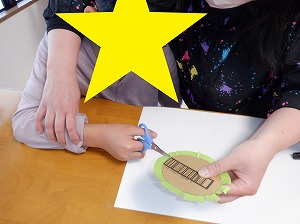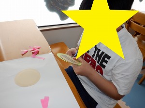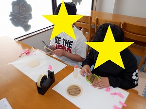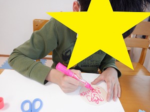 工作は「母の日メダル」を作りました。お母さんの顔や自分の好きな言葉を書いて仕上げました。