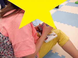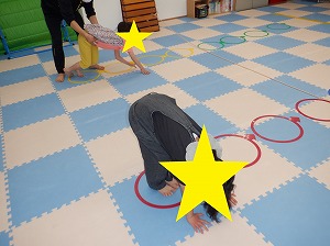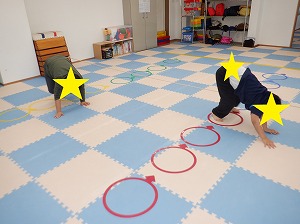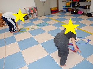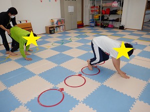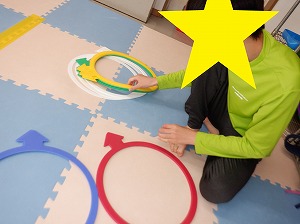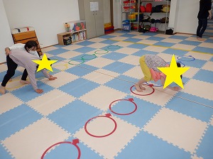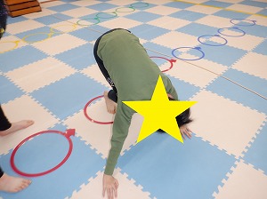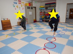 両足をフープに入れて、両手はフープの外に置きます。両足ジャンプをして横のフープに移動しました。繰り返し上手に跳べていました。