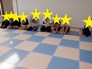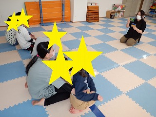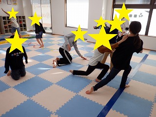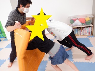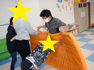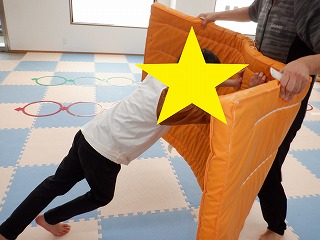 お相撲さんごっこでは、お友達と協力して職員に押し負けないようにマットを押しましょう。瞬発力、脚力、協調性を養います。