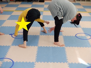 両足を肩幅に開き、上半身を前に倒し足の間からお友達を見ながら、ジャンケンをします。