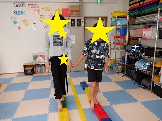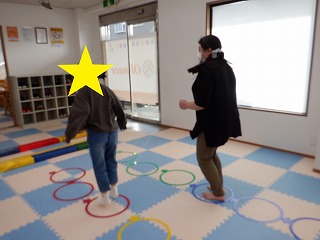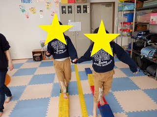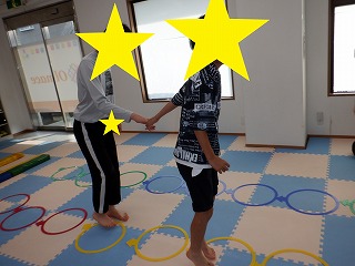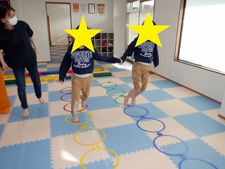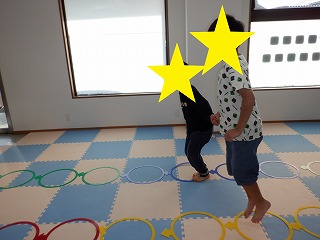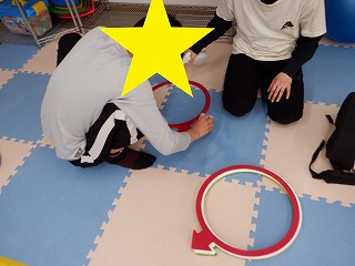 2人でジャンプでは、二人一組で手を繋いで、フープを跳んで進んでいきます。息を合わせてお友達とペースを合わせましょう。協調性を養います。