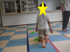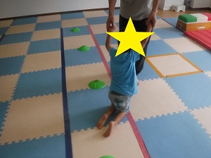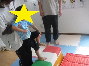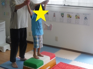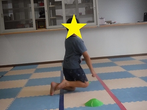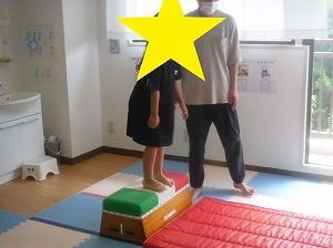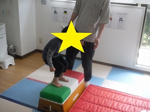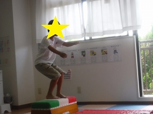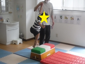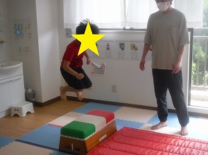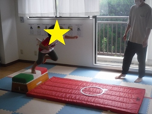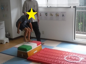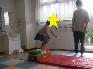 膝を曲げて跳び箱の上に飛び乗ります。距離感も養うことが出来ます。