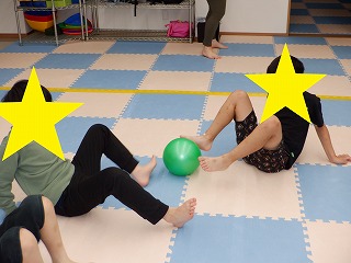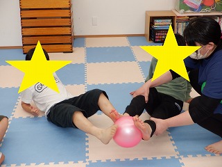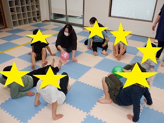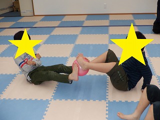 手を床につき足でボールを挟んでお友達へ渡します。