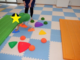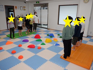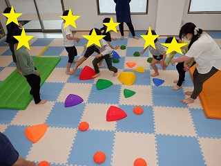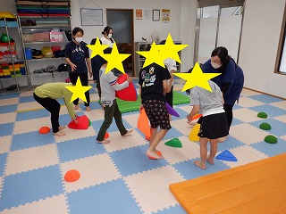 例として「オレンジ陣地のお友達は信号の止まれの色を触って緑の陣地へ!」等のお題が出されるので先生のいう事をしっかり聞いて行動します。