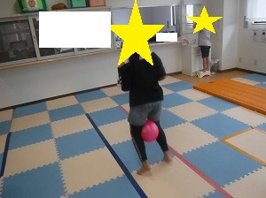 ボールを足で挟んで、カンガルージャンプをします(^^)