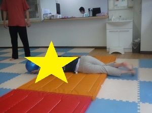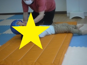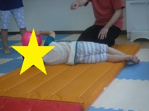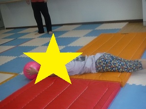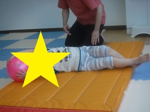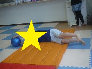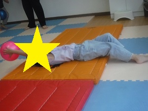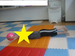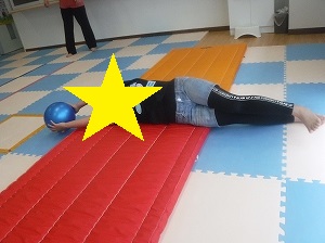 ボールを持って、手足を伸ばし、マットを転がります。