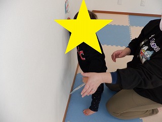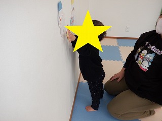 壁につかまり立ちをしながら雪だるまにタッチをしました。