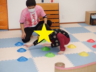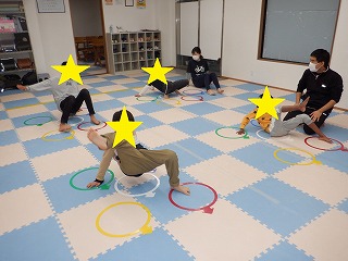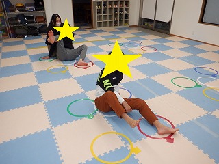 おへそは上で四つん這いになり指定された色のフープの手足を上げましょう。