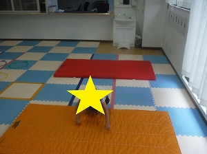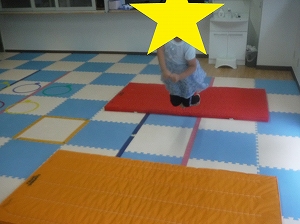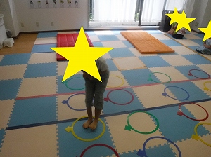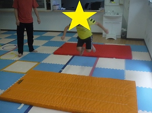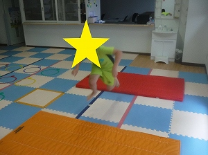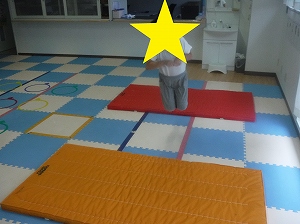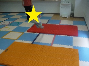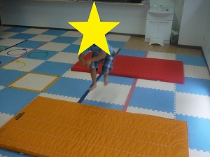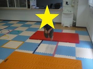 両足を揃えて、マットからマットへと飛び移ります。