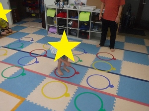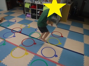 指定された色のフープをカンガルー跳びで渡ります。