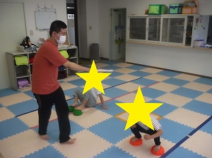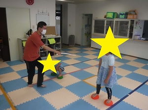 小さなバランスボール2個を10~15㎝程間隔をあけて置きます。バランスボールに足を乗せ、職員がゆっくり動かすやわらかい棒をバランスボールから落ちないように、避けます。