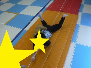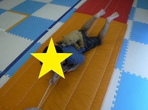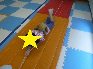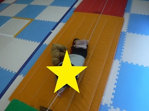 ロープを両手で強く引いて進みます(^^)これは逆上がりで腕を引く力を養います!