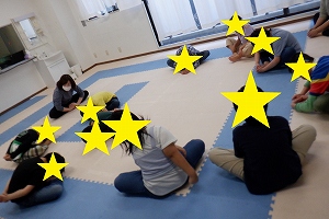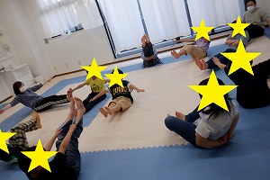 怪我をしないように柔軟体操で体をほぐしましょう!バランスは両足を揃えたまま10秒間浮かせます。お腹に力を入れて頑張ろう!