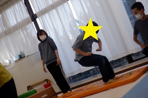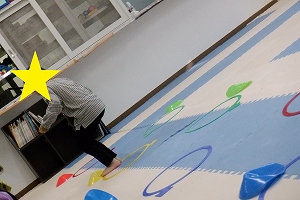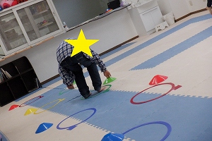 カンガルージャンプは足を揃えて跳びます。カップを優しくタッチして進みましょう!