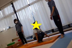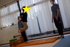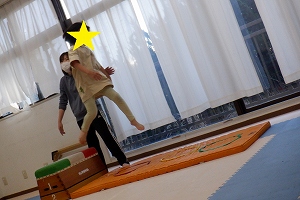 ジャンプをして跳び箱の上に乗ります。次にマット上のフープに向かって跳びます。